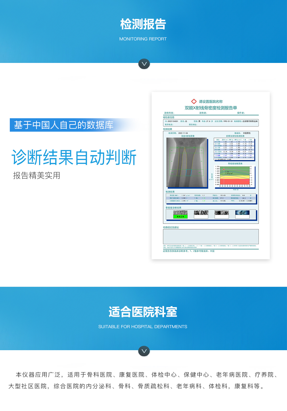 適用于骨科醫(yī)院、康復(fù)醫(yī)院、體檢中心、保健中心、老年病醫(yī)院、療養(yǎng)院、大型社區(qū)醫(yī)院,綜合醫(yī)院的內(nèi)分泌科、骨科、骨質(zhì)疏松科、老年病科、體檢科、康復(fù)科等。